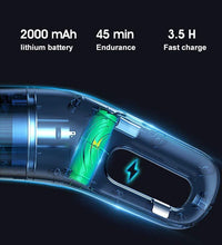 Product Origin: Guangdong, Chinaa With or without bag: Bagless Power (W):120 Engine Type: Brushless Engine After-sales Service: Return and Replace Warranty: 1 Year \ nInstallation: Manual Function: Wet & Dry \ nApplication: Hotel, Car, Household \ nPower Source: Battery AWS \ nOperated: APP \ n1Vt \ n1: 5watt \ n 30-60 min \ nNet weight: ≤ 0. 5 kg \ nNozzle number: 4-6 \ nProduct name: Handheld vacuum cleaner \ nColor: Blue, black \ nMaterial: ABS + PVS: 4000 \ nPower: 120 W \ nRated voltage: DC 7. 4 \ nCharging input: 5V = 2 \ nDust capacity: 0. 1 LBattery capacity: 1800 mAh * 2 \ nCharging time: 2 hours: Type: