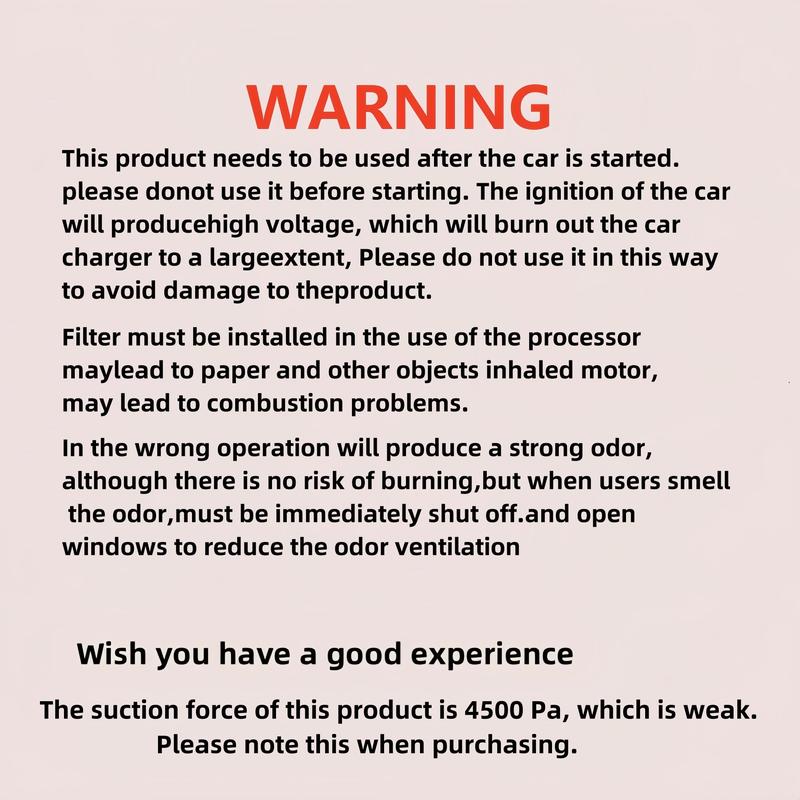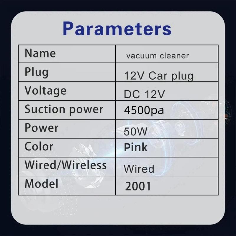 【Portable Design】: Easy to carry and use anywhere in the car. 【Multipurpose Cleaning Tool】: Beyond just a car vacuum cleaner, this versatile cleaning tool can be used on various surfaces and in multiple settings, from your car to your home or office, ensuring a tidy environment wherever you are. 【Portable & Easy to Use】: The baby pink, portable design of this car vacuum cleaner makes it incredibly convenient to store and carry, ensuring you can keep your car cleaner handy for various quick clean-up or road trip. 【Strong Suction & Large Power】: Equipped with a powerful motor, this 12V car vacuum cleaner offers exceptional suction and power, ensuring a thorough cleaning even in hard-to-reach areas of your car. 【Versatile Cleaning Ability】: With its powerful suction and ability to clean various surfaces, this portable car vacuum cleaner is not just for cars but also perfect for cleaning homes and other spaces, keeping your environment tidy wherever you go.